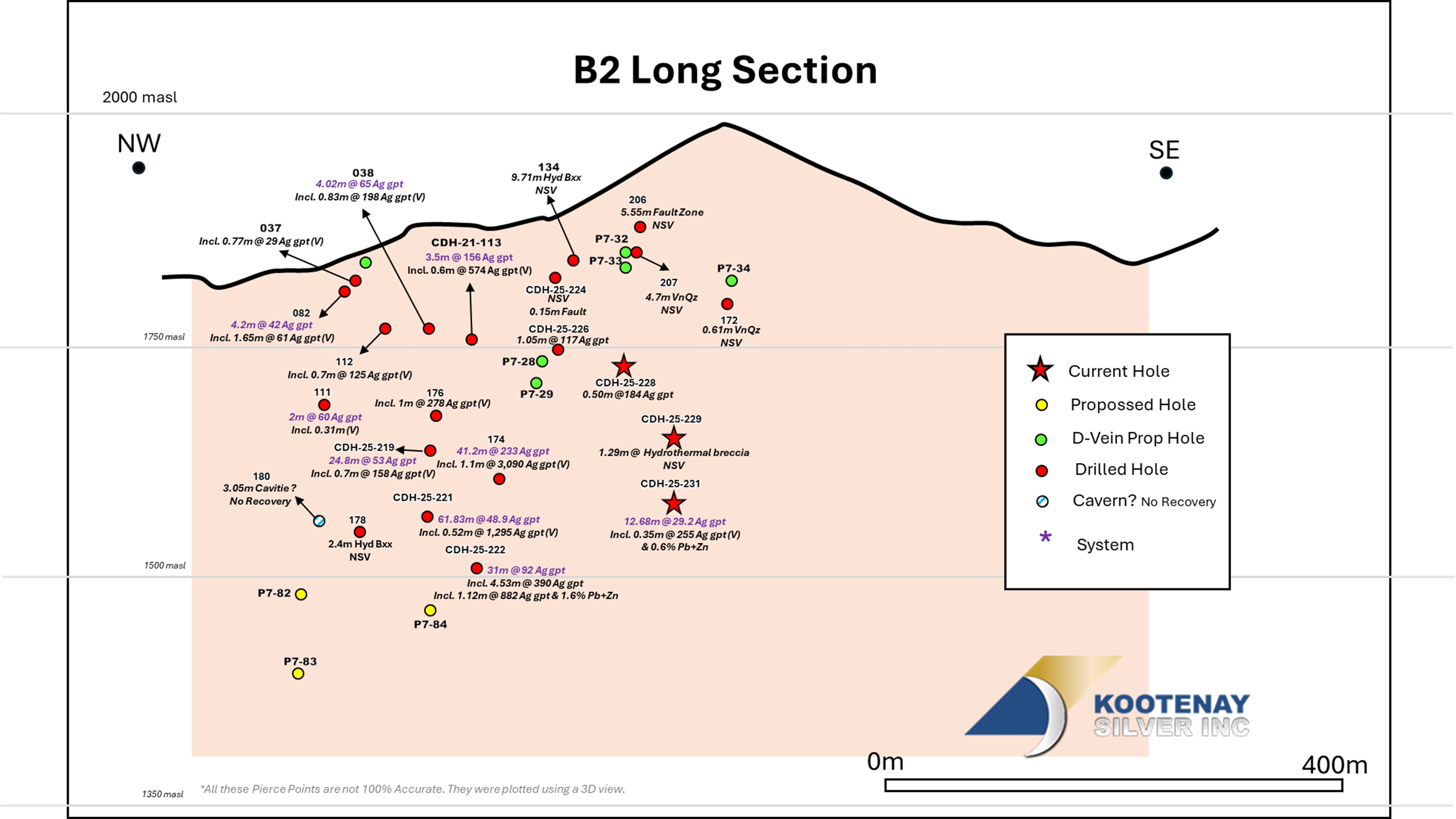 Hole CDH-25-230 was a step out hole and holes CDH-25-232 and 234 were drilled to test a large 200m long zone in the central D Vein trend. Of interest, CDH-25-230 intercepted a thin hanging-wall vein above the D Vein target grading 0.7m of 1,020 gpt silver, 0.6% lead and 1.5% zinc. Hole CDH-25-232 intersected a broad low-grade section on the D trend with a thin high grade footwall vein of 3,640 gpt silver over0.3 meters.
