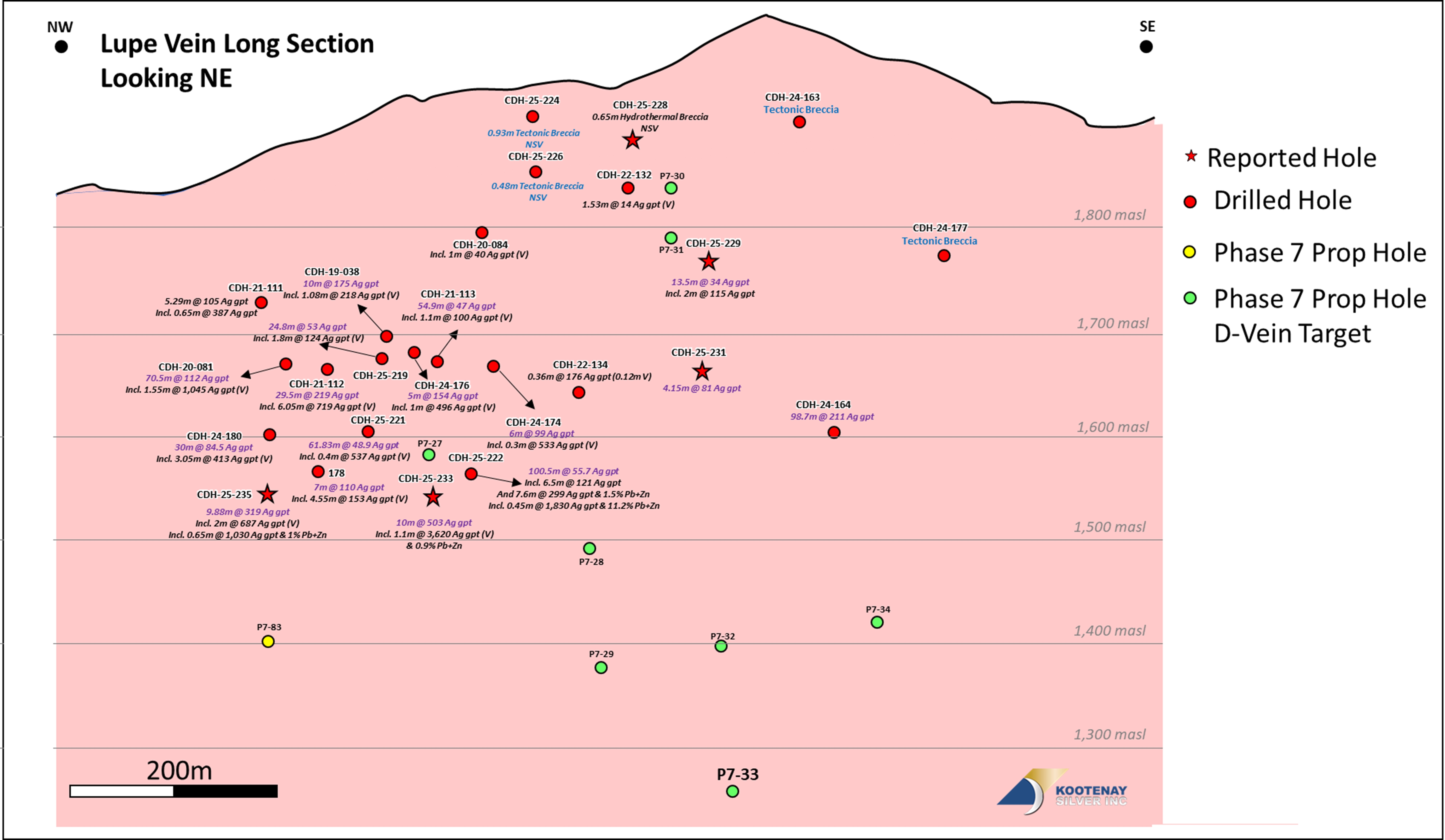 Five holes form this corridor are reported herein, two of which, CDH-25-233 and 235 represent the deepest intersections on Lupe Vein to date, both holes returning >1000 gpt silver.
